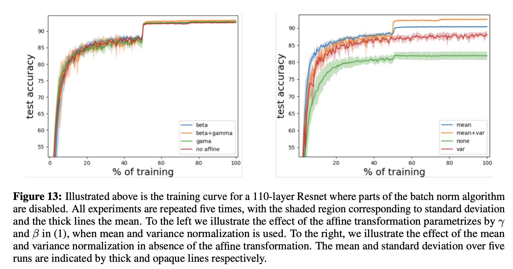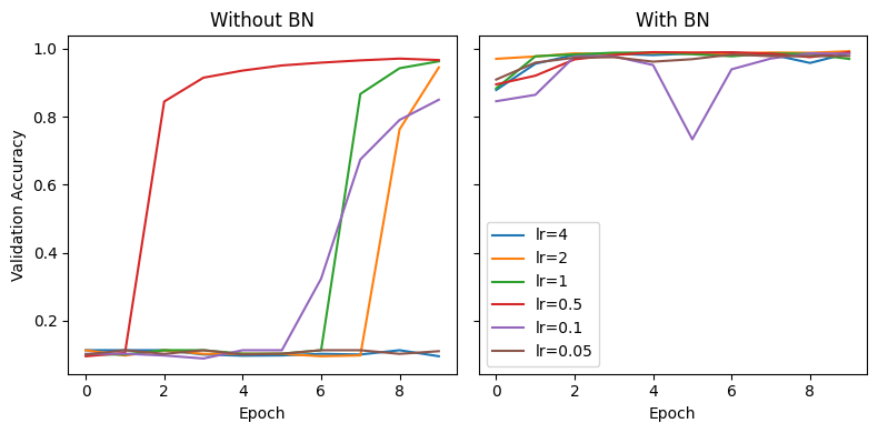 Note: In Q4 and Q5 we removed various components of batch norm layers were removed and performance was compared. However, we used the same fixed learning rate \(0.1\) for all configurations. A more thorough analysis would have found the optimal learning rate for each configuration, as Appendix F of the paper does: