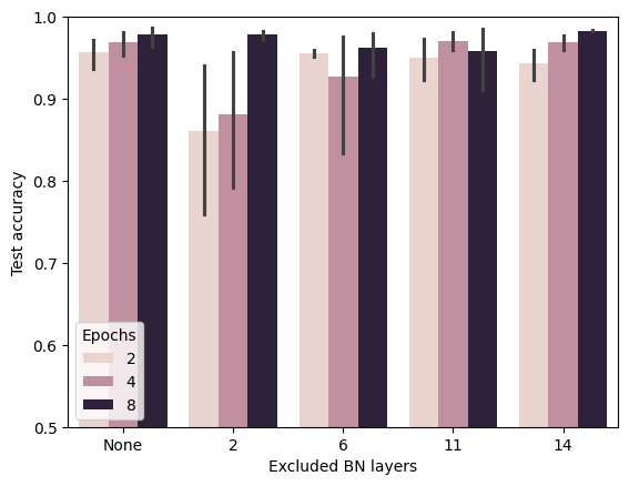 res = pd.DataFrame(results)res['Excluded BN layers'].replace({0: 'None', 1: '2', 2: '6', 3: '11', 4: '14'}, inplace =True)sns.barplot(data = res, x ='Excluded BN layers', y ='Test accuracy', hue ='Epochs')plt.ylim(0.5, 1)