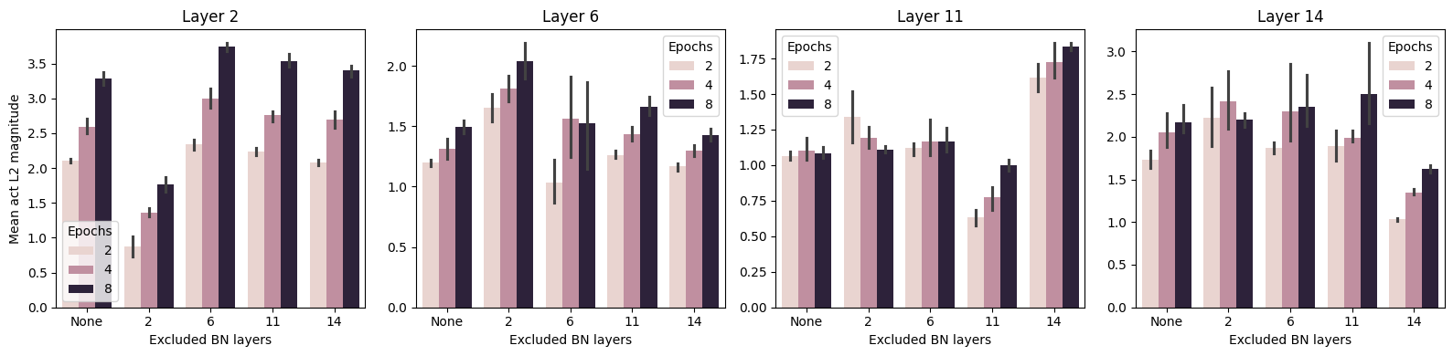 f, axs = plt.subplots(1, 4, figsize=(16, 4))for i, lyr inenumerate(mag_layers): sns.barplot(data = res, x ='Excluded BN layers', y =f'Mean mag at {lyr}', ax = axs[i], hue='Epochs') axs[i].set_title(f'Layer {lyr}') axs[i].set_ylabel('')axs[0].set_ylabel('Mean act L2 magnitude')f.tight_layout()