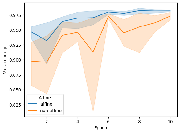 tmp = []for aff, res in results.items():for i, test_accs inenumerate(res):for epoch, acc inenumerate(test_accs): tmp.append({'Affine': aff, 'Val accuracy': acc, 'Seed': i, 'Epoch': epoch +1})tmp = pd.DataFrame(tmp)sns.lineplot(data = tmp, x ='Epoch', y ='Val accuracy', hue ='Affine')