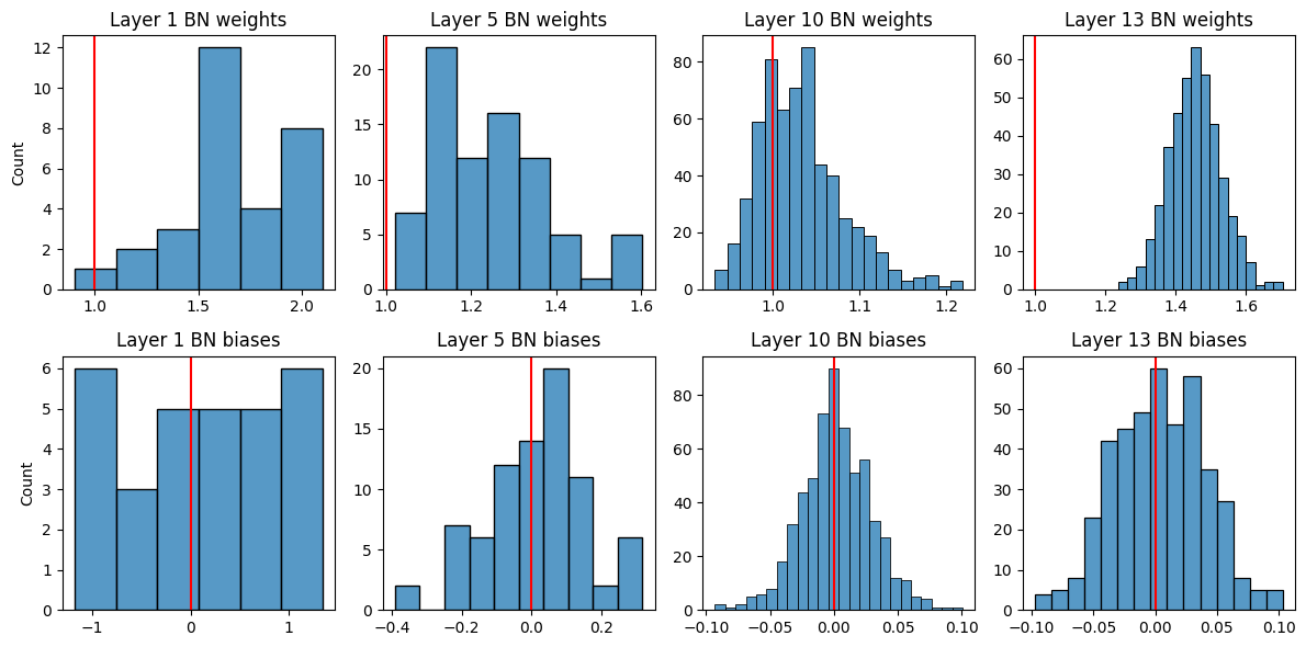 layers = [1, 5, 10, 13]weights = {l:[] for l in layers}biases = {l:[] for l in layers}for fname in os.listdir('nets'):if'non'in fname: continue net = torch.load('nets/'+ fname)for layer in layers: weights[layer].extend(net.net[layer].weight.detach().tolist()) biases[layer].extend(net.net[layer].bias.detach().tolist())f, axs = plt.subplots(2, 4, figsize=(12, 6))for i, (layer, w) inenumerate(weights.items()): sns.histplot(w, ax = axs[0, i]) axs[0, i].set_title(f'Layer {layer} BN weights') axs[0, i].axvline(1, c ='r') sns.histplot(biases[layer], ax = axs[1, i]) axs[1, i].set_title(f'Layer {layer} BN biases') axs[1, i].axvline(0, c ='r')if i >0: axs[0, i].set_ylabel(''); axs[1, i].set_ylabel('')f.tight_layout()
