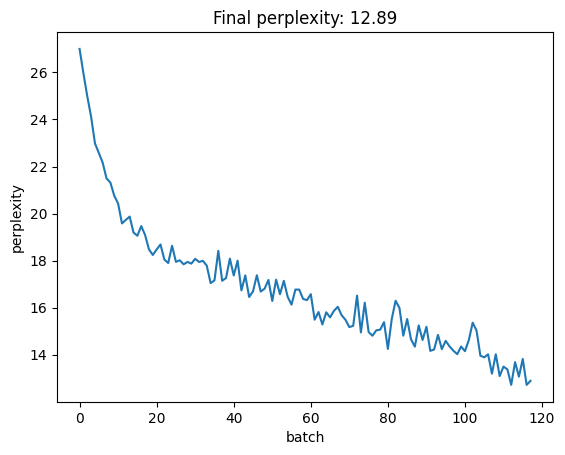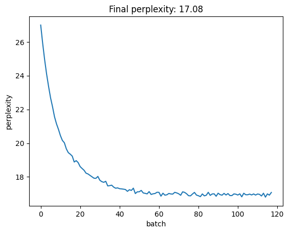 Text(0.5, 1.0, 'Final perplexity: 12.89')