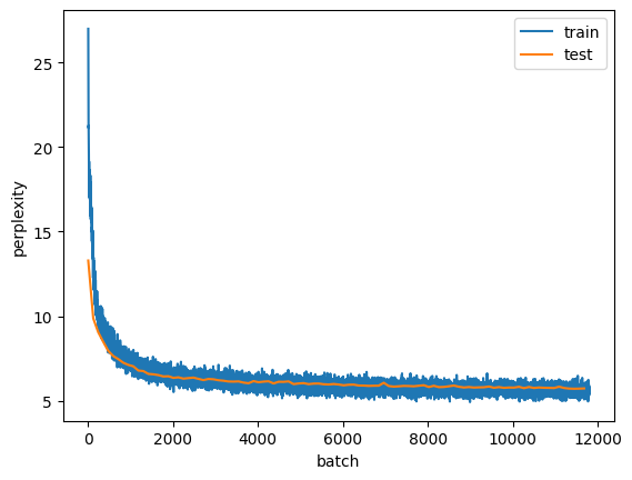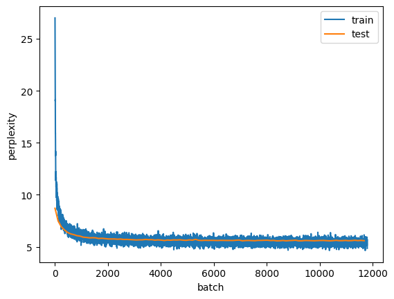 opt = optim.SGD(m.parameters(), lr =1)train_perplexities, test_perplexities = [], []for _ inrange(100):for X, Y in train_loader: opt.zero_grad() outputs = m(X) outputs = outputs[-1] targets = Y[:, -1] loss = F.cross_entropy(outputs, targets) loss.backward() nn.utils.clip_grad_norm_(m.parameters(), 1) # Clip the gradient opt.step() train_perplexities.append(np.exp(loss.item())) test_perplexities.append(eval(m, test_loader))plt.plot(train_perplexities, label ='train')plt.plot(list(range(0, len(train_perplexities), len(train_loader))),test_perplexities, label ='test')plt.legend(); plt.xlabel('batch'); plt.ylabel('perplexity')