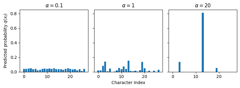 We can do so by multiplying the logits by \(\alpha\) (inverse temperature) before applying softmax. Notice that as \(\alpha \rightarrow 0\) we sample tokens uniformly at random, and as \(\alpha \rightarrow +\infty\) we’ll select the most probable token.