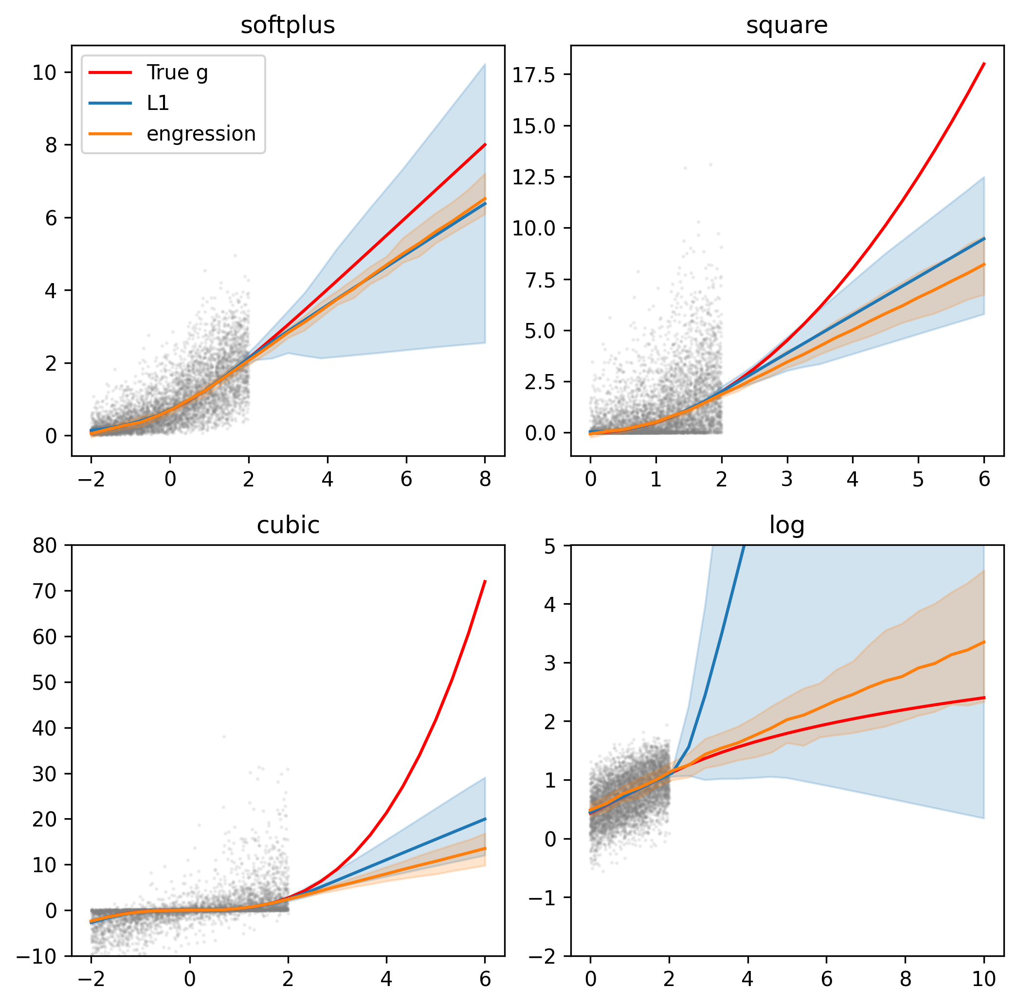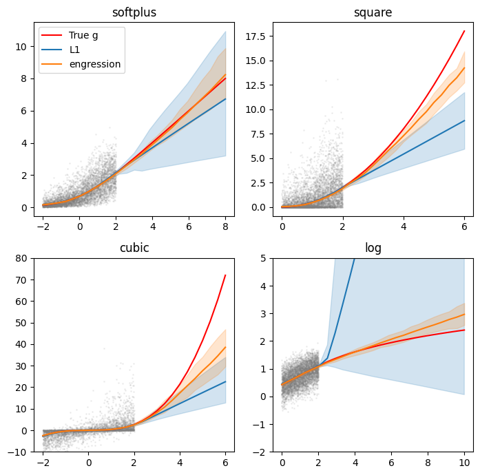 Finally, we attempt to replicate Figure 4 from the paper using simulated data with pre-additive noise. For the softplus case, for example, we generate \(X \sim \text{Unif}[-2, 2]\), \(\eta \sim \mathcal N(0, 1)\) and set \(Y = g^\ast(x + \eta)\) with \(g^\ast(t) = \log(1+\exp(t))\). We then train simple MLPs using the engression loss and evaluate their ability to recover the true median — given by \(g^\ast(x)\) — especially outside the range of the training data.