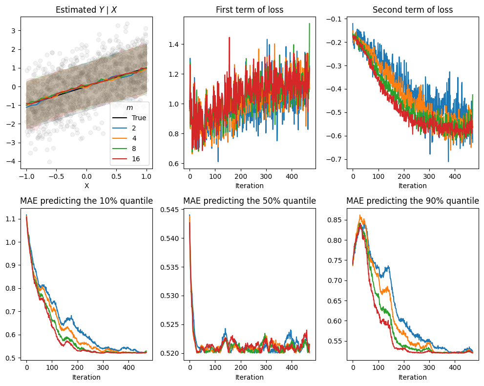 Effects of varying \(m\) on a simple example. Increasing \(m\) yields more stable losses and faster reduction in the error estimating \(Y|X\) quantiles.