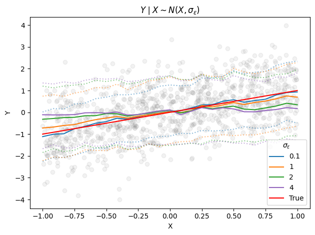 For instance, in our imperfect toy setup \(\sigma_\varepsilon\) seems to resemble a smoothing or locality parameter: large values encourage distant \(x\)’s to map to the same \(y\), producing smoother estimates. Imagining a one dimensional \(\varepsilon\), and \(g(x, \varepsilon) = g(x + \varepsilon)\) should help with this intuition.
