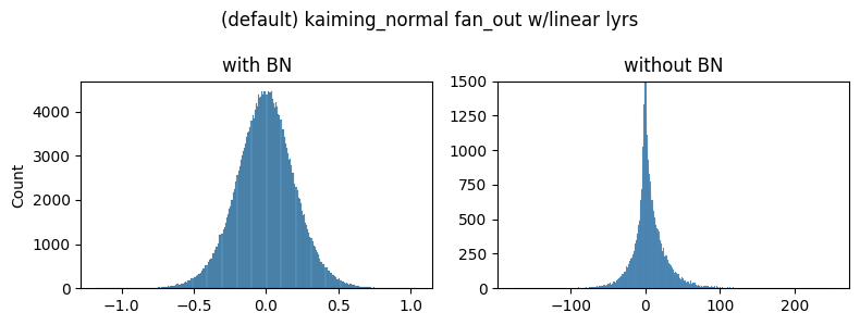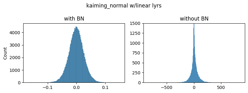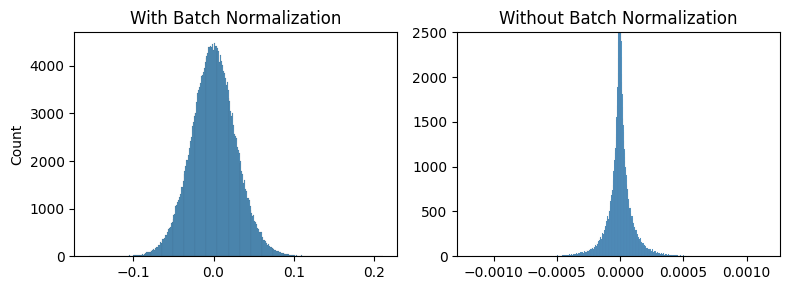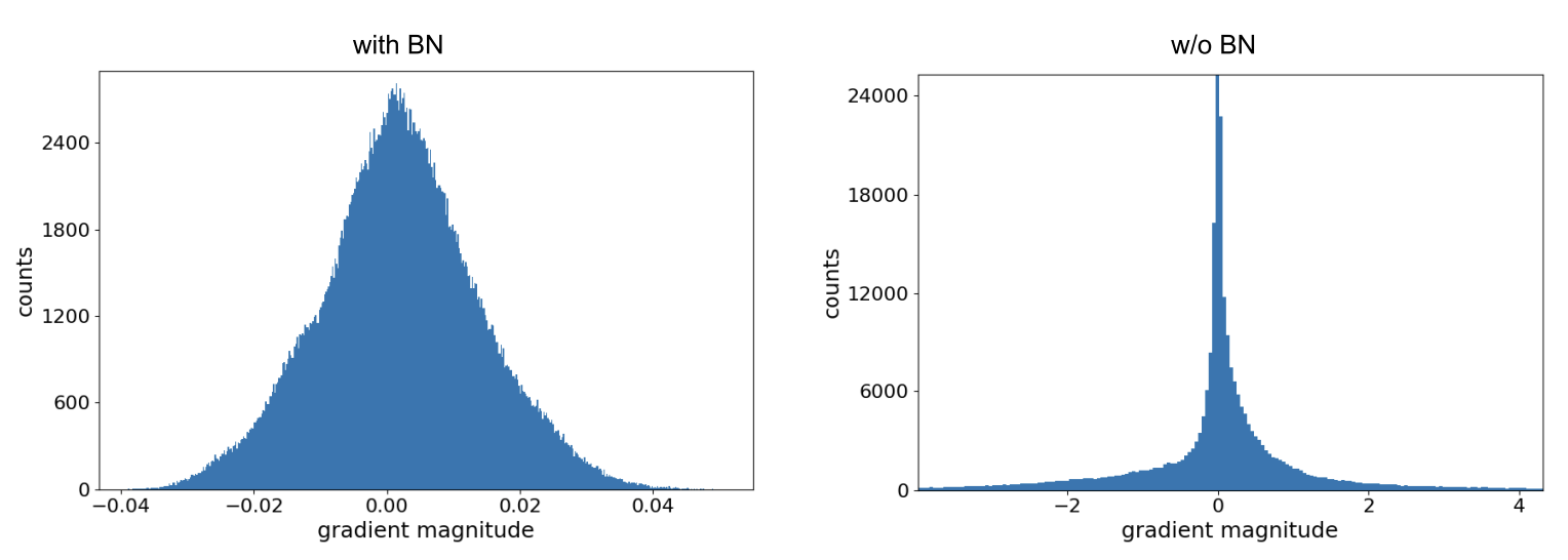 So, the authors analyze the gradients at initialization of a midpoint layer (55) with and without batch norm. They find that gradients in unnormalized networks are consistently larger and distributed with heavier tails.