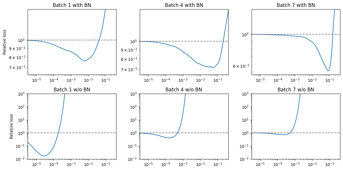 def fig3(model, init_lr, log_lrs, log_batches = [1, 4, 7]):# batch -> list of relative losses for each lr out = {} criterion = nn.CrossEntropyLoss() optimizer = optim.SGD(model.parameters(), lr = init_lr, momentum =0.9, weight_decay =5e-4)for i, (images, labels) inenumerate(train_loader): images, labels = images.to(device), labels.to(device)if i in log_batches: torch.save(model.state_dict(), f'models/model_state.tmp') torch.save(optimizer.state_dict(), f'models/optimizer_state.tmp') rel_losses = []for lr in log_lrs:for param_group in optimizer.param_groups: param_group['lr'] = lr optimizer.zero_grad() output = model(images) current_loss = criterion(output, labels) current_loss.backward() optimizer.step()with torch.no_grad(): output = model(images) tmp_loss = criterion(output, labels) rel_loss = (tmp_loss / current_loss).item()# print learning rate, current loss, tmp loss, relative loss (at 4 decimal places)print(f'{lr:.5f}{current_loss:.5f}{tmp_loss:.5f}{rel_loss:.5f}') rel_losses.append(rel_loss) model.load_state_dict(torch.load('models/model_state.tmp')) optimizer.load_state_dict(torch.load('models/optimizer_state.tmp')) # If loss is nan of int, break. Unlikely to recover.if torch.isnan(tmp_loss).item() or torch.isinf(tmp_loss).item(): rel_losses.pop()print('breaking')break out[i] = rel_lossesif i ==max(log_batches): break# take the actual step optimizer.zero_grad() output = model(images) loss = criterion(output, labels) loss.backward() optimizer.step()return outlrs = np.logspace(-5.5, 0.5, 80)# With BNmodel = models.resnet101(num_classes =10)model.to(device)model.apply(init_net)with_bn = fig3(model, init_lr =0.1, log_lrs = lrs)# Without BNmodel = models.resnet101(num_classes =10)model.to(device)disable_bn(model)model.apply(init_net)without_bn = fig3(model, init_lr =0.0001, log_lrs = lrs)