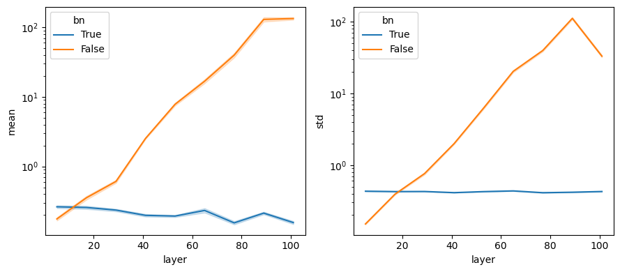 f, (ax1, ax2) = plt.subplots(1, 2, figsize = (9, 4))sns.lineplot(data = df, x ='layer', y ='mean', hue ='bn', ax = ax1)ax1.set_yscale('log')sns.lineplot(data = df, x ='layer', y ='std', hue ='bn', ax = ax2)ax2.set_yscale('log')f.tight_layout()