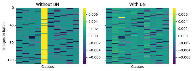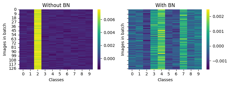 “A yellow entry indicates that the gradient is positive, and the step along the negative gradient would decrease the prediction strength of this class for this particular image. A dark blue entry indicates a negative gradient, indicating that this particular class prediction should be strengthened. Each row contains one dark blue entry, which corresponds to the true class of this particular image (as initially all predictions are arbitrary). A striking observation is the distinctly yellow column in the left heatmap (network without BN). This indicates that after initialization the network tends to almost always predict the same (typically wrong) class, which is then corrected with a strong gradient update. In contrast, the network with BN does not exhibit the same behavior, instead positive gradients are distributed throughout all classes.”